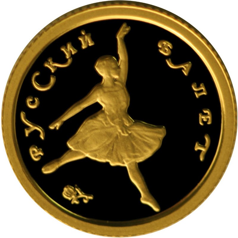 Золотая монета 1993 г. Банка России из серии «Русский балет». У нее качество пруф. Тираж: 11500 штук.